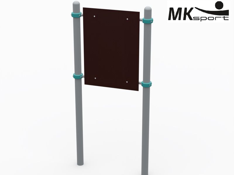 Воркаут-зона должна быть не только функциональной, но и безопасной. Для размещения всей информации о правилах поведения на площадке и инструкций по использованию снарядов и нужен информационный стенд. Он выполнен из тех же материалов и в той же цветовой гамме, что и все воркаут-оборудование. Это позволяет органично вписать его в спортивную площадку. Щит покрыт слоем ламината, а опорные столбы закрыты сверху металлическими заглушками, что защищает изделие от попадания влаги внутрь конструкции. Щит фиксируется на основных столбах с помощью стальных хомутов. Металлический каркас покрыт цинкосодержащим грунтом и порошковой полимерной краской.